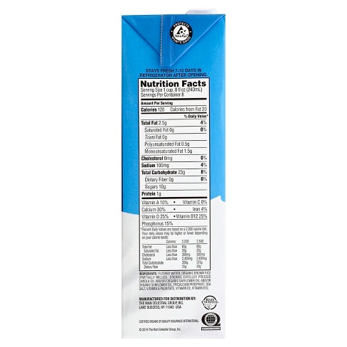 Rice milk nutrition label. Vitamin b12 helps in healthy regulation of the nervous system reducing depression stress and brain shrinkage. One cup of plain rice milk such as rice dream provides 120 calories 25g fat. Filtered water whole brown rice min.